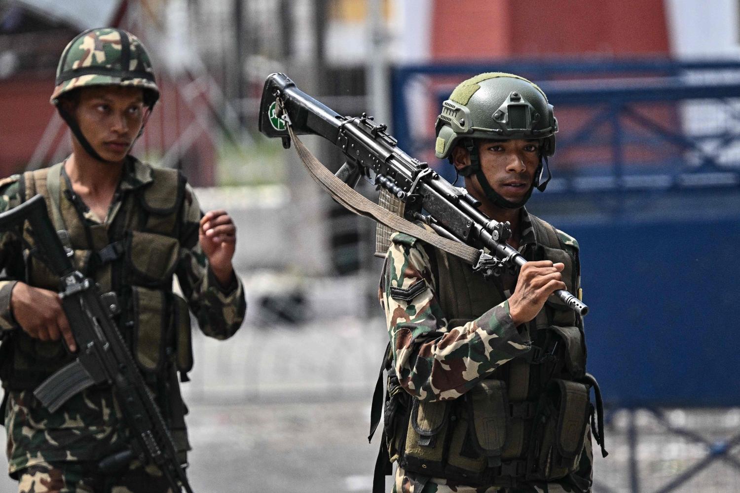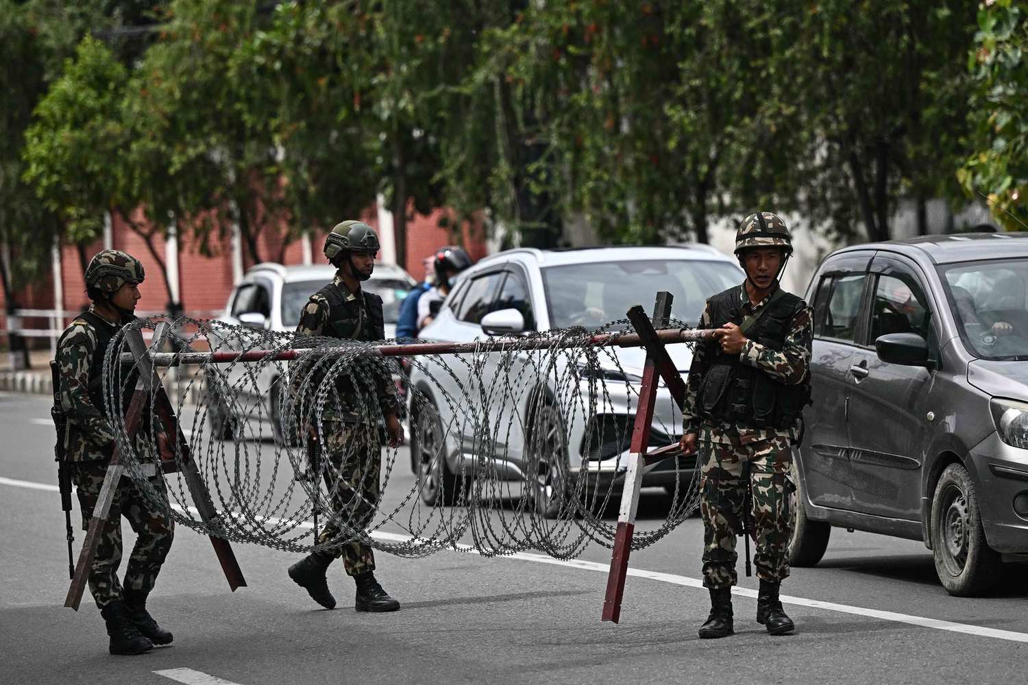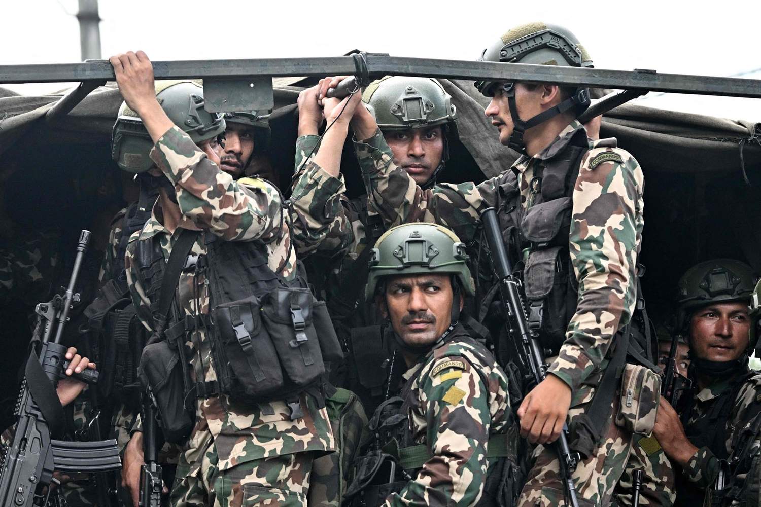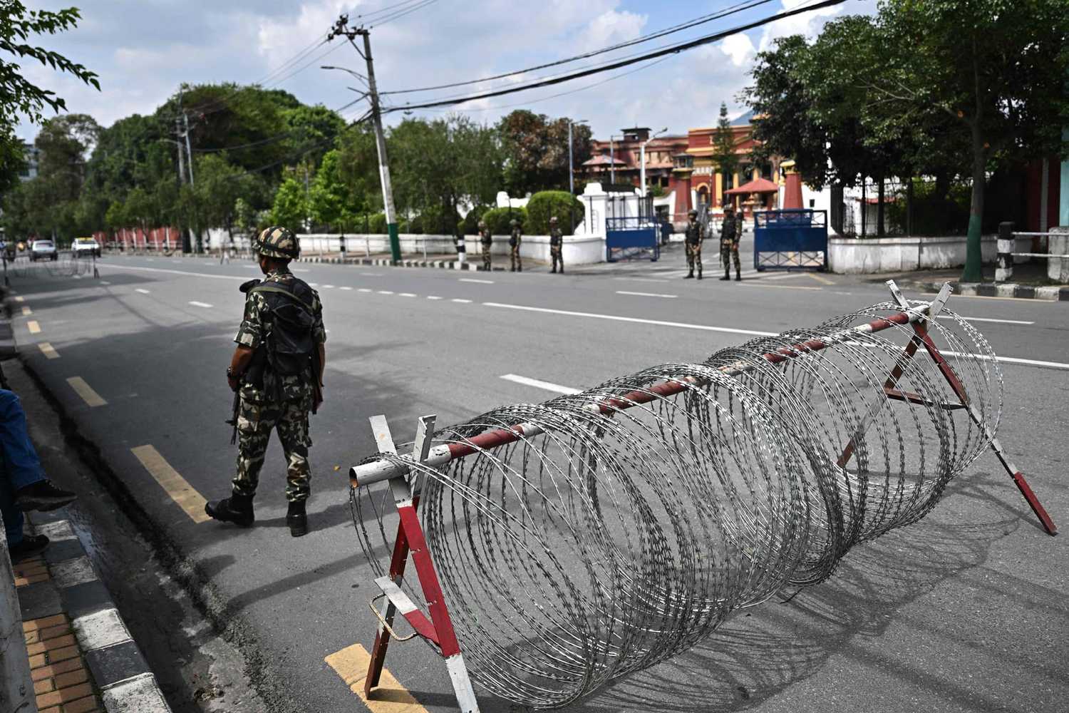 Army personnel patrol along a street during a curfew imposed to restore law and order in Kathmandu on September 12, 2025. The army has imposed a curfew in the Himalayan nation of 30 million people, with soldiers patrolling the largely quiet streets after the worst violence in two decades. (Photo by Pedro Pardo / AFP)