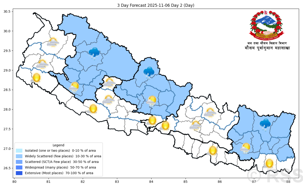 Kathmandu, Nov 6: There is a possibility of light rain or snowfall at one or two places in the hilly regions of Koshi, Gandaki, and Karnali Provinces today.